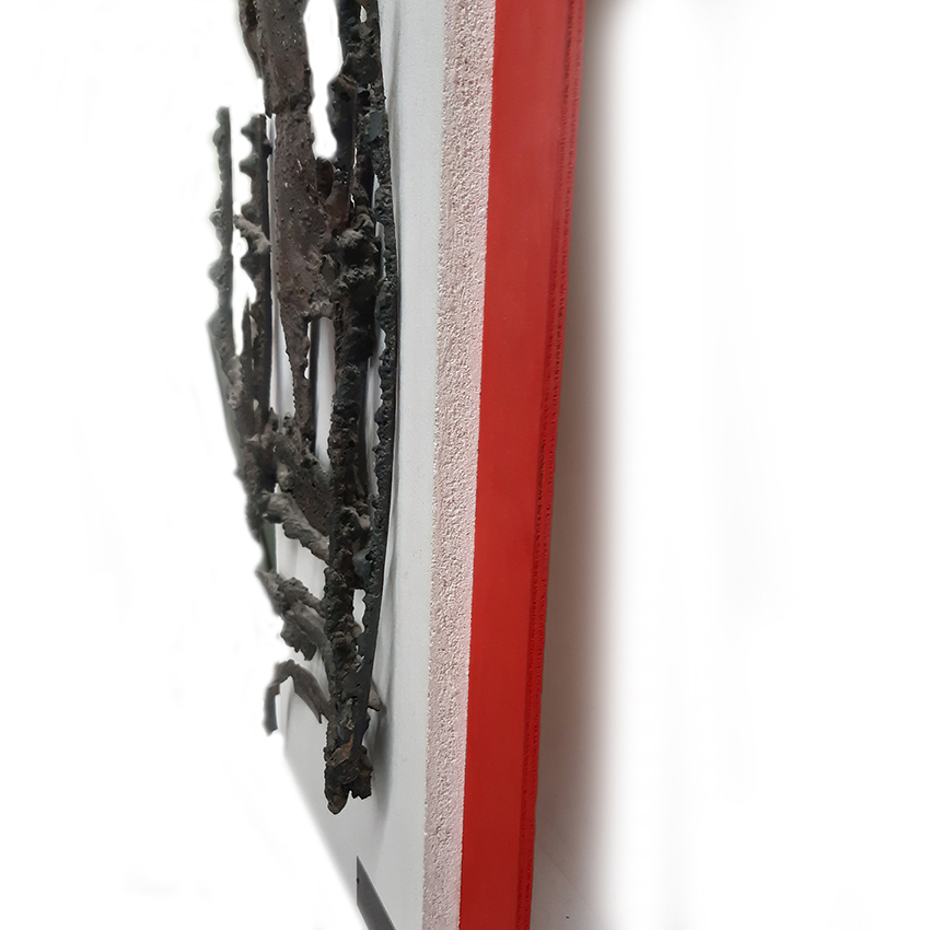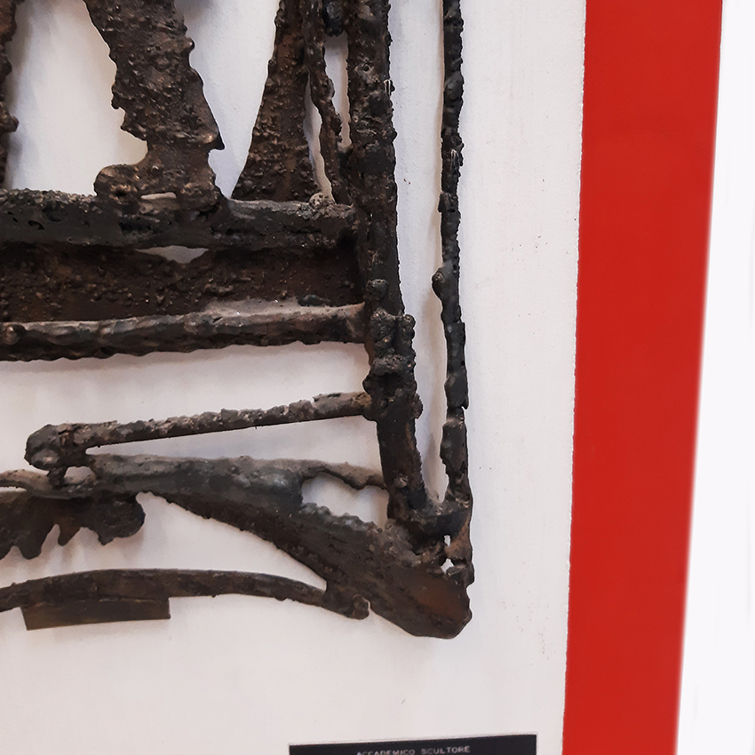 L’opera è inserita all’interno di un pannello bianco di legno delle dimensioni di 60 X 30 cm e di spessore 2 cm posto su una tavola di compensato e di colore rosso dallo spessore di 0,5 cm.
