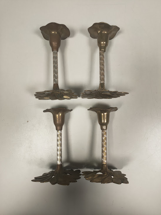 Lotto di 4 Porta Candele in Ottone con Fusto in Metallo “Art Noveau” Vintage Anni ’60
