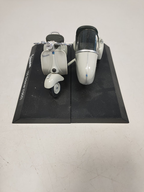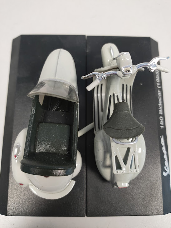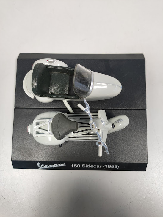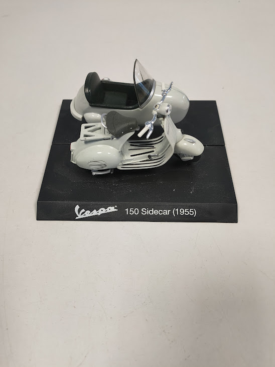Dettagli: Il modellino è montato su una base nera con la scritta identificativa “Vespa 150 Sidecar (1955)”