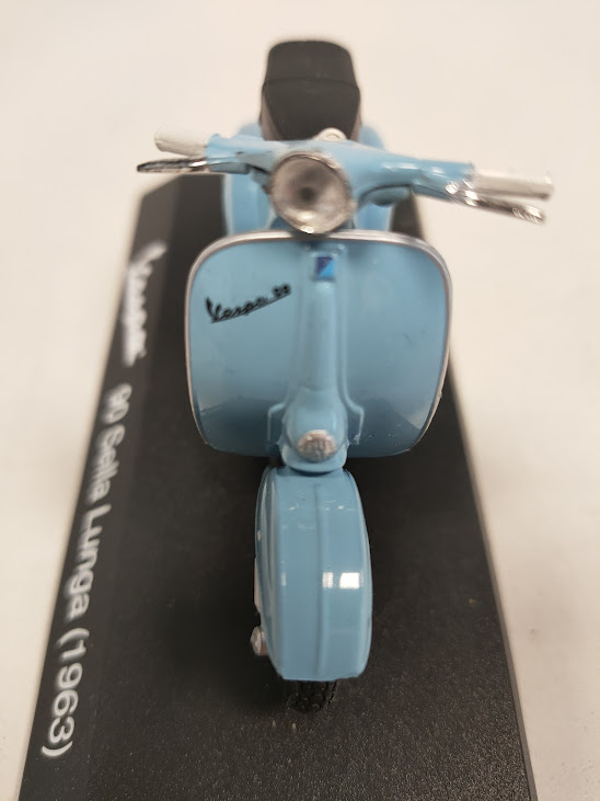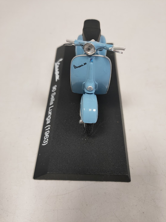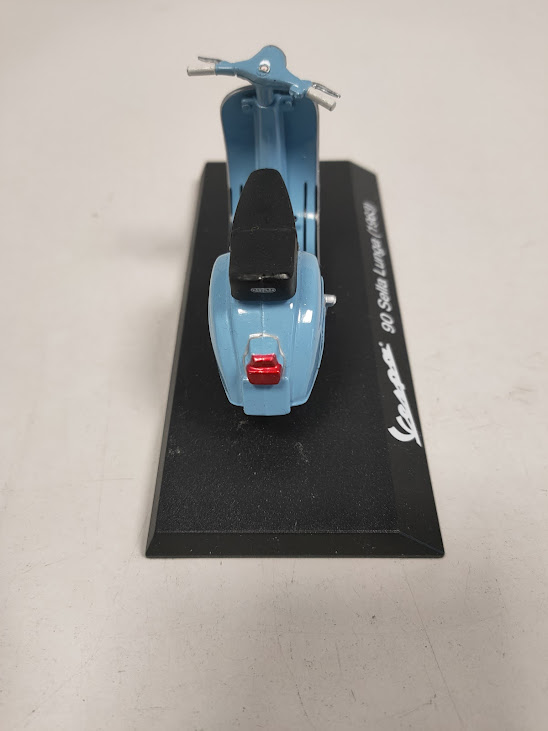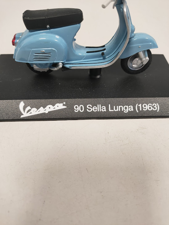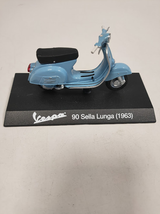Base: Il modellino è montato su una base espositiva nera con la scritta “Vespa 90 Sella Lunga (1963)”