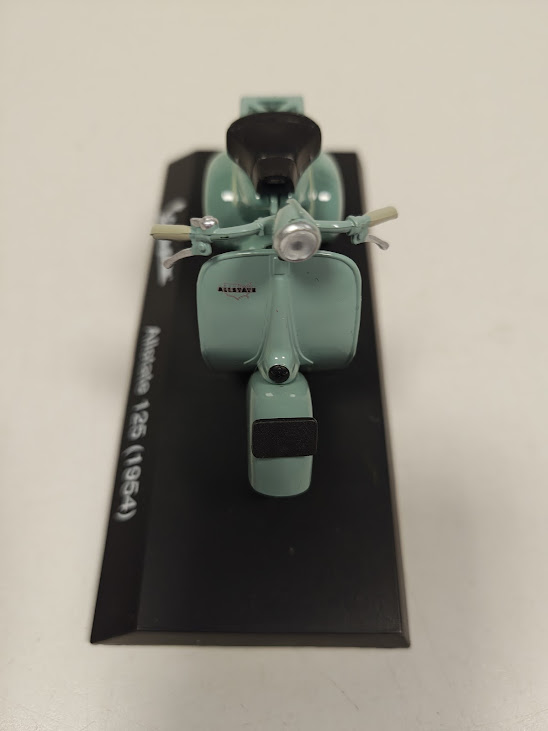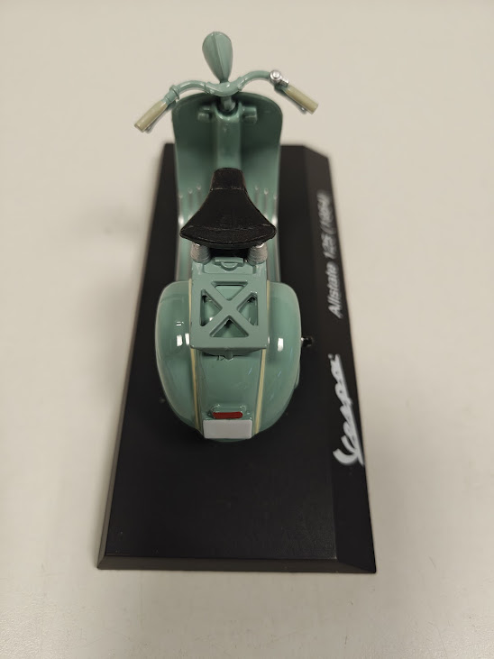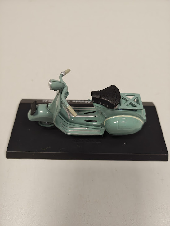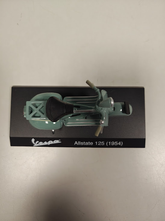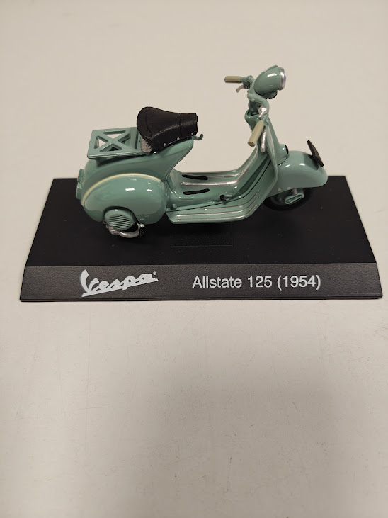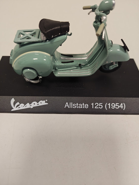 Questo oggetto è un modellino da collezione in scala 1:18 della Vespa Piaggio Allstate 125 del 1954, riconoscibile dalla colorazione verde acqua e dalla targa sulla base