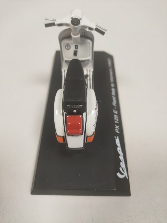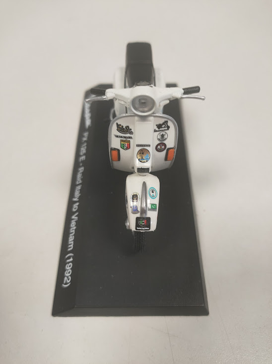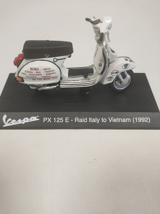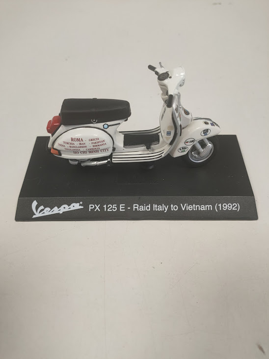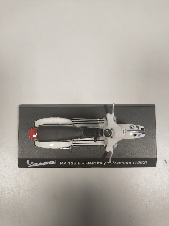 Materiale: Il modellino è montato su una base nera che riporta la dicitura “Vespa PX 125 E – Raid Italy to Vietnam (1992)”