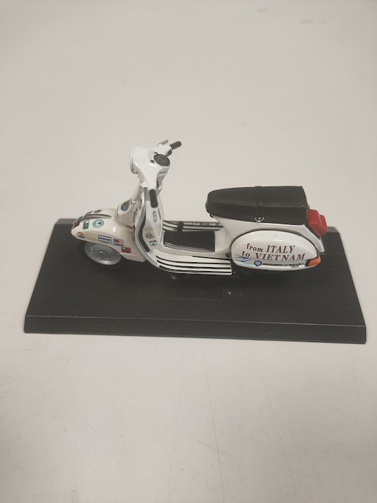 Questo oggetto è un modellino da collezione che raffigura una Vespa PX 125 E, famosa per il raid “Italia – Vietnam” del 1992.