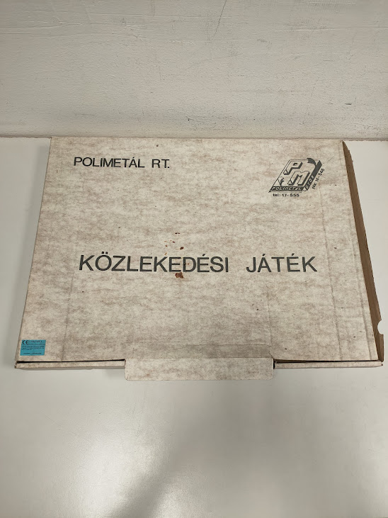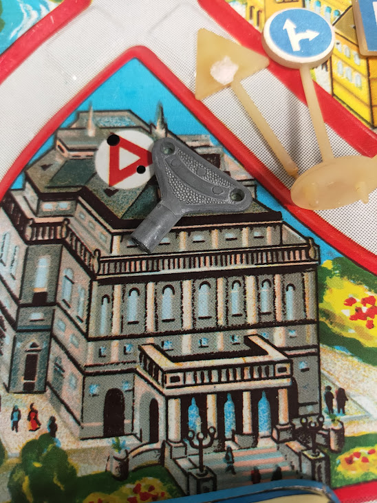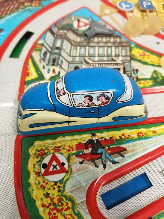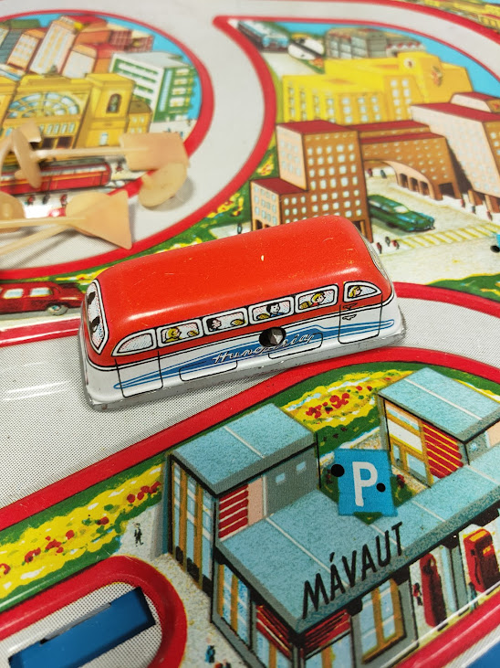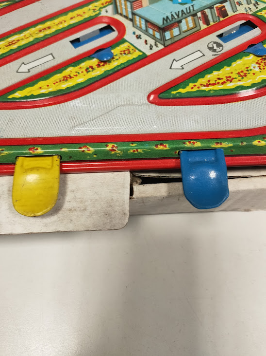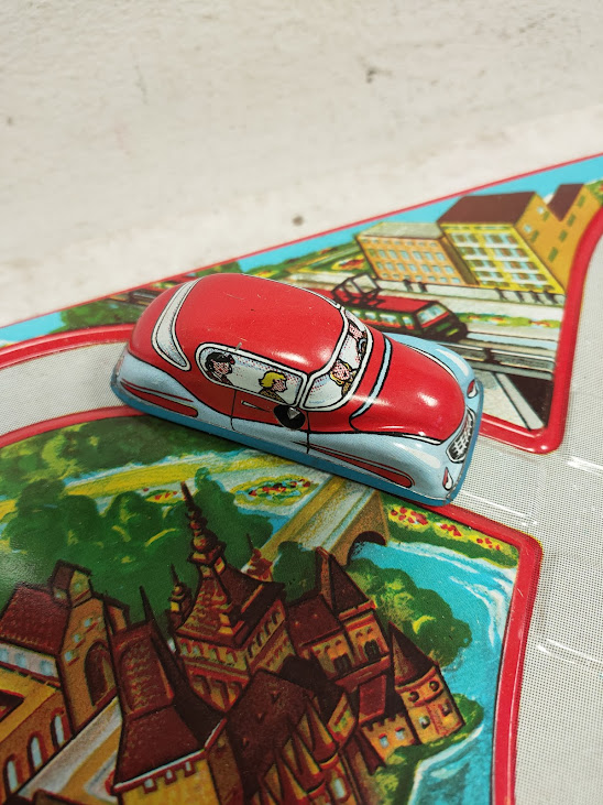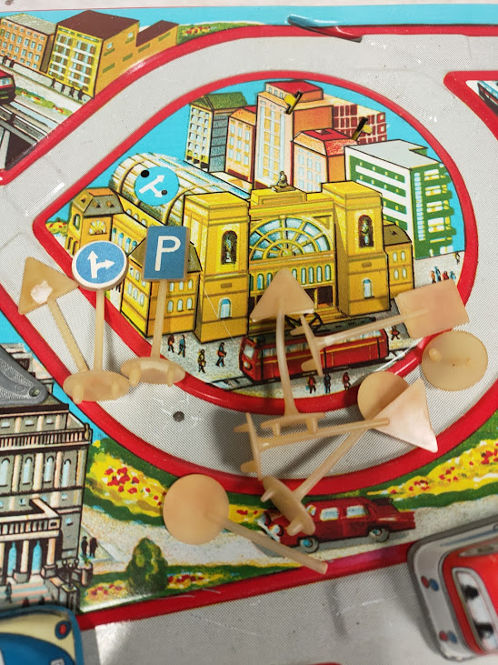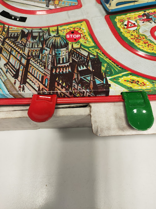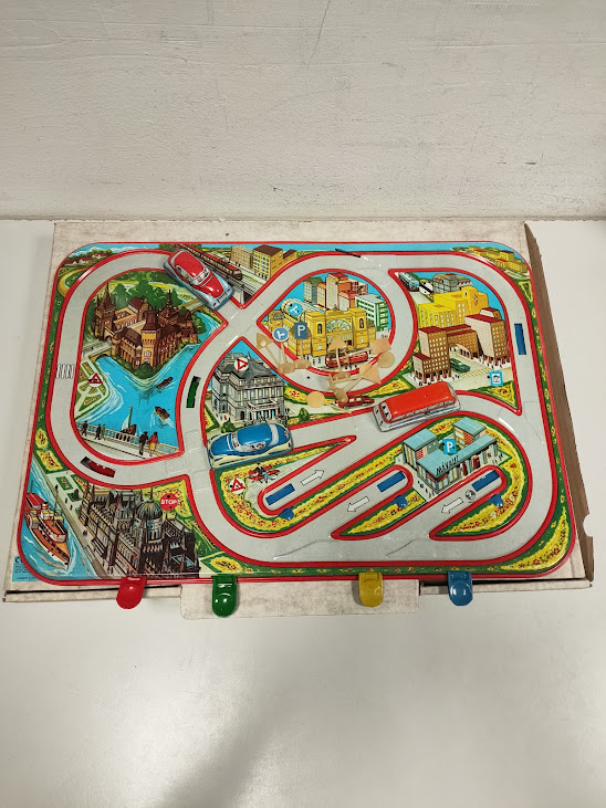 Il gioco, risalente agli anni ’60, è un set a carica manuale che include piccoli segnali stradali e veicoli in latta che percorrono i binari litografati.