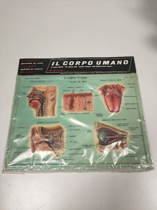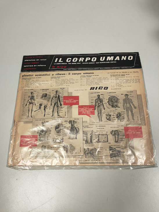 Tavola anatomica con confezione originale. La plastica della confezione presenta segni d’invecchiamento