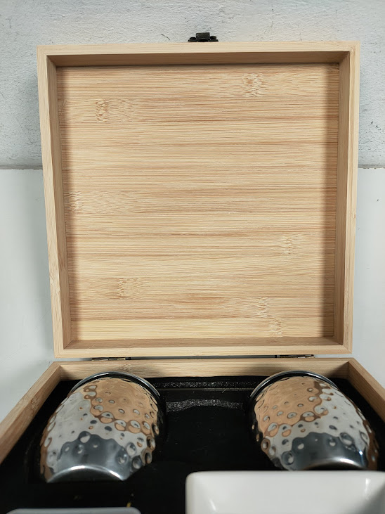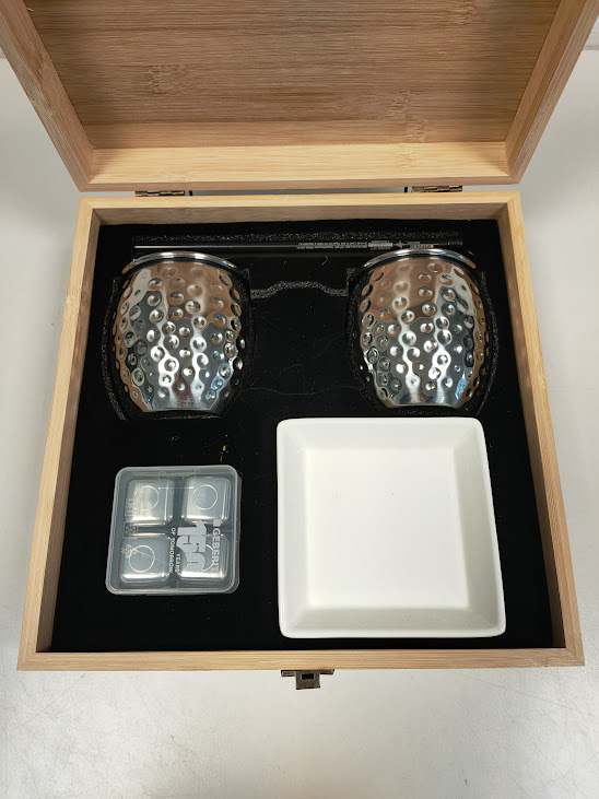 Questo set include una scatola in legno, 2 tazze, Cubetti da ghiaccio, un piatto in porcellana e 2 pinze/agitatori