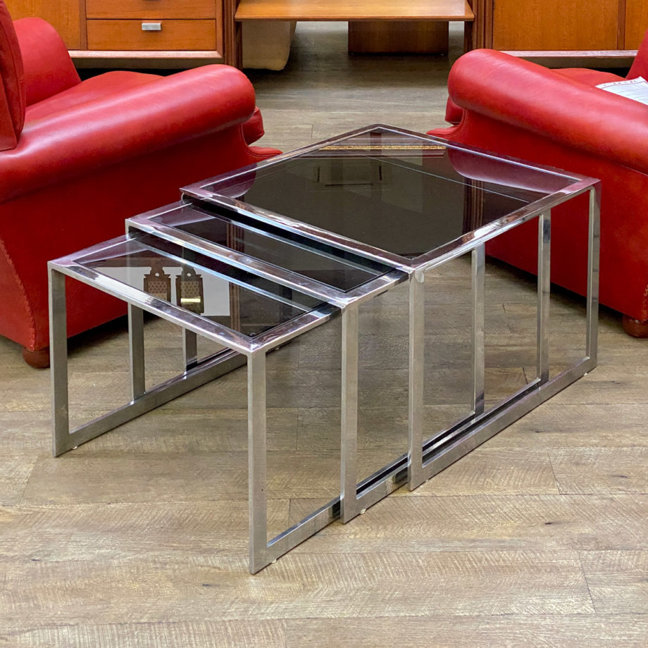 Elegante e funzionale set di 3 tavolini ad incastro Vintage in metallo cromato con piano in vetro fumè.