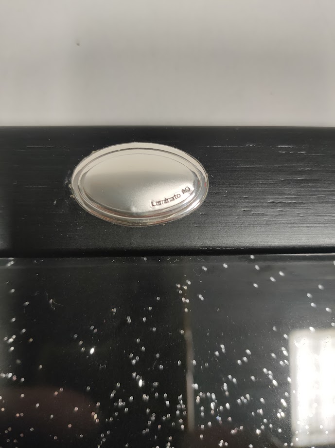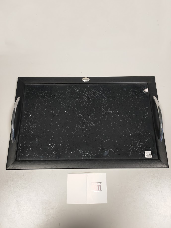 Il vassoio è di colore nero in plastica e legno con rifiniture argentate