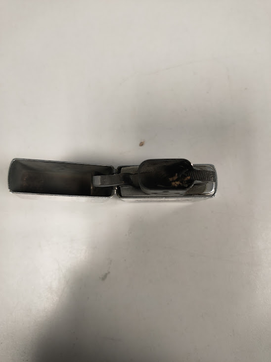 Sull’accendino è rappresentata una nave sovrapposto a un globo blu con la scritta “U.S.S. Saratoga CV-60” in rosso nella parte inferiore